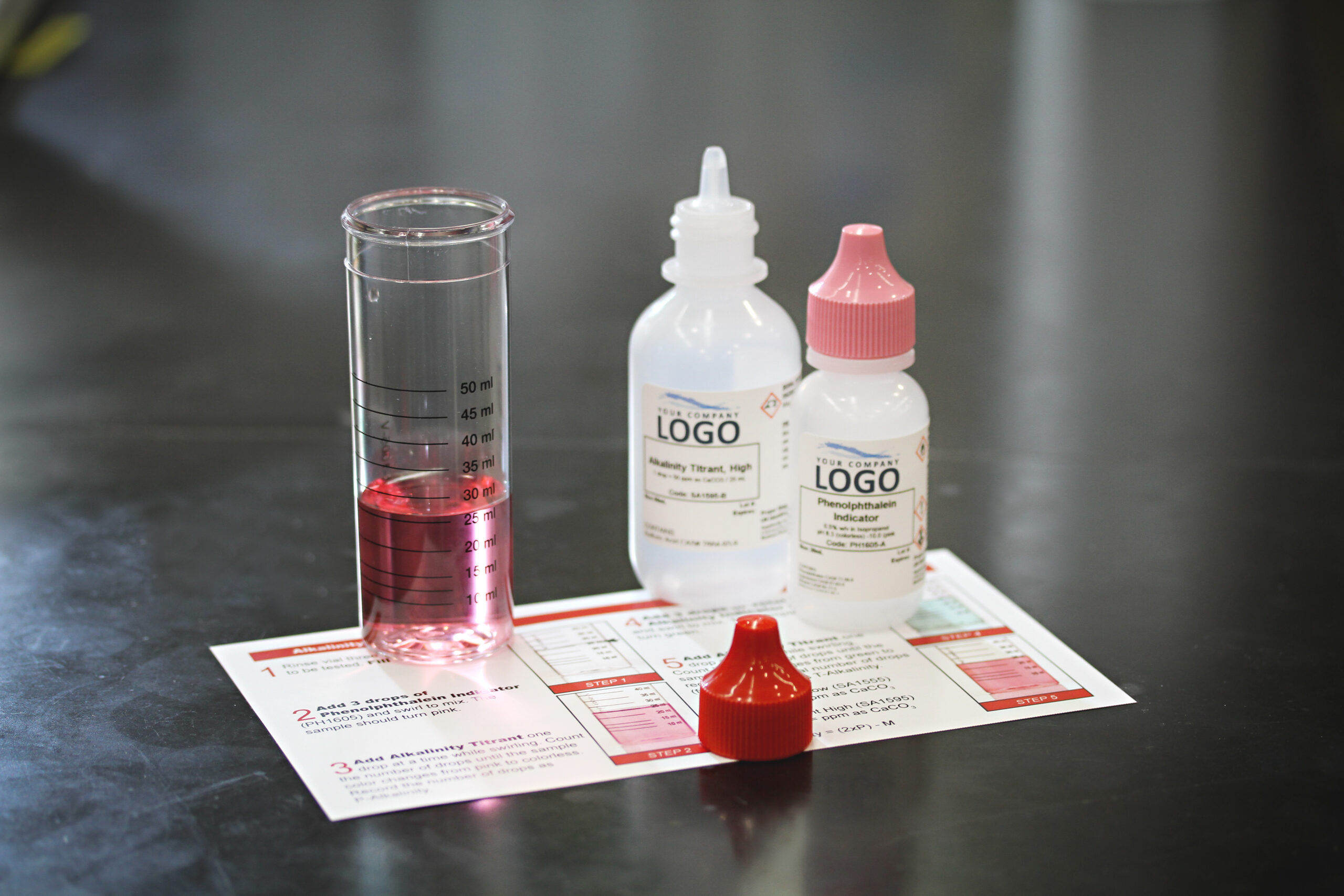 Our most common alkalinity test kit includes these reagents: