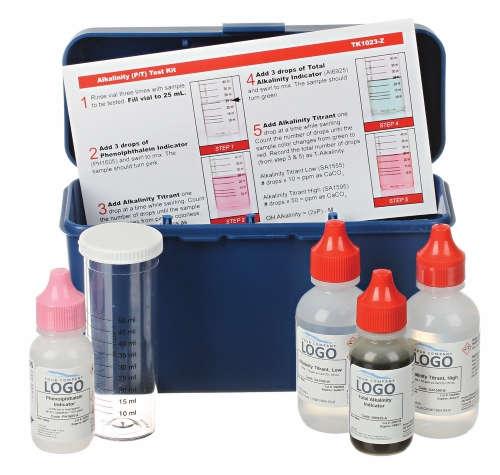 Alkalinity test kits are available for P, M, T and OH alkalinity. Each EndPoint ID test kit is packaged in a durable, plastic case to protect the contents. Reagent bottles are stored vertically to minimize leaks and each kit includes all necessary equipment, reagents and an instruction card and can run approximately 60 to 75 tests.